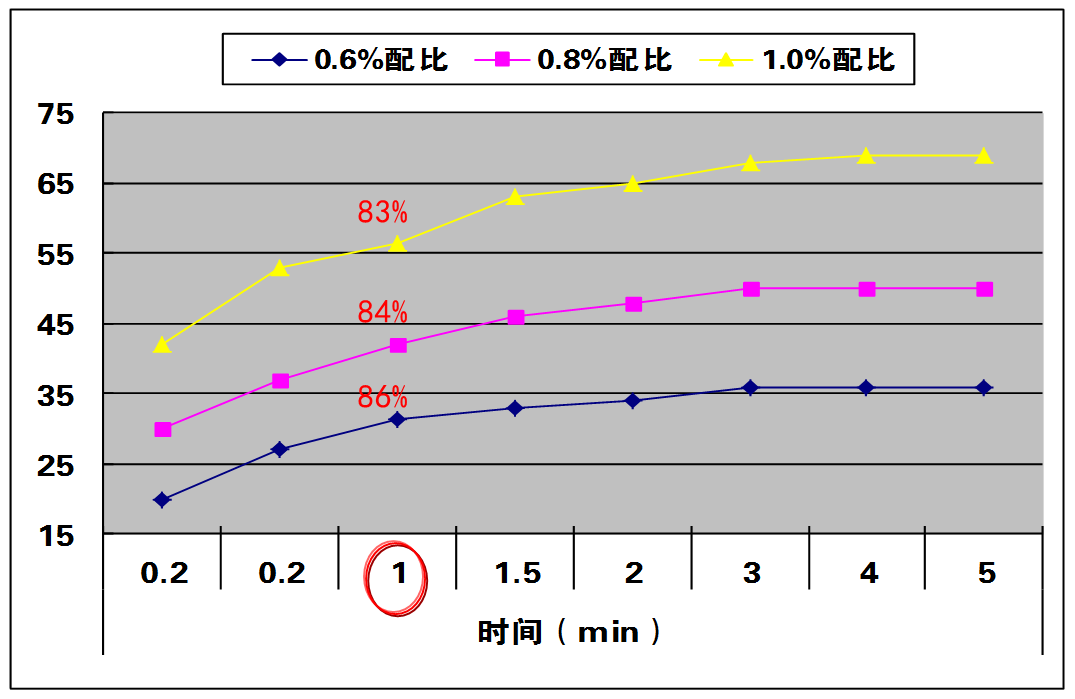 配制0.6~1.0%不同配比的稠化剂溶液,其基液粘度随着配比的提高不断增大,配制1min内粘度释放率高达83%以上。